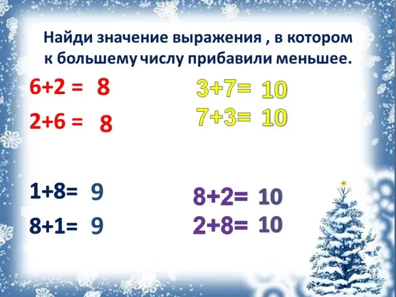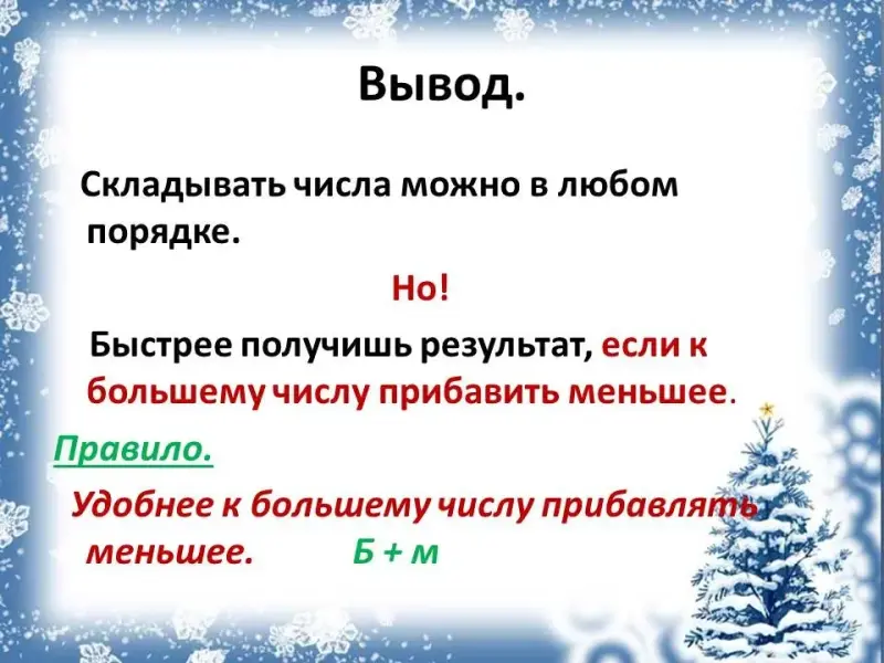 Вывод: Складывать числа можно в любом порядке. Но быстрее получишь результат, если к большему числу прибавить меньшее.