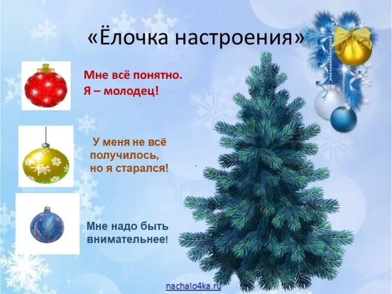 - Какое настроение у вас в конце урока? Нарядите ёлочку, выбирая шары: