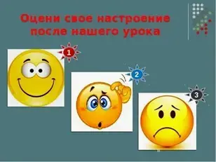 И в завершении нашего путешествия нарисуйте в рабочем листе тот смайлик, который соответствует вашему восприятию урока…. Покажите свои рисунки. (Учитель собирает листы).