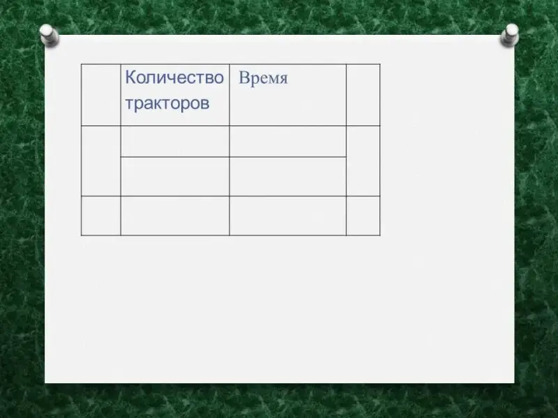 Задача № 1: Три трактора вспахали поле за 8 часов. Сколько нужно тракторов, чтобы вспахать такое же поле за 6 часов?