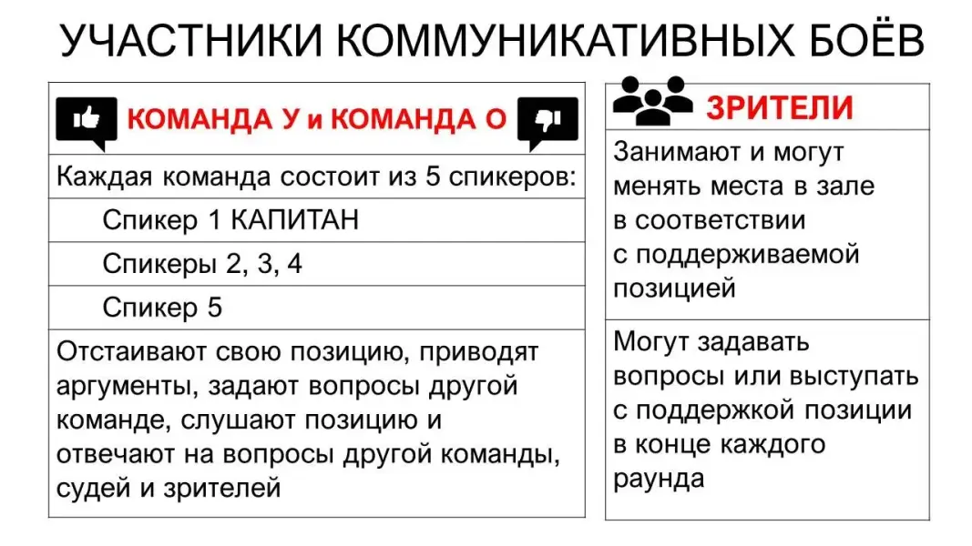 Задача команд в КБ - предложить наиболее сильные аргументы, а также убедить судей и зрителей в верности своей точки зрения.