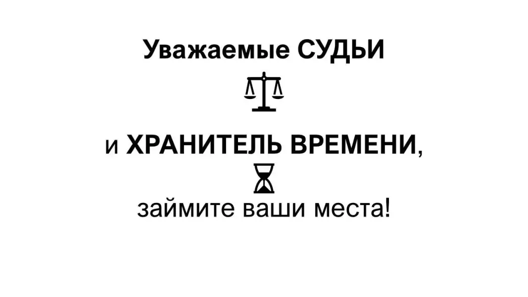 Ведущий представляет судей и хранителя времени и предлагает им занять их места. |