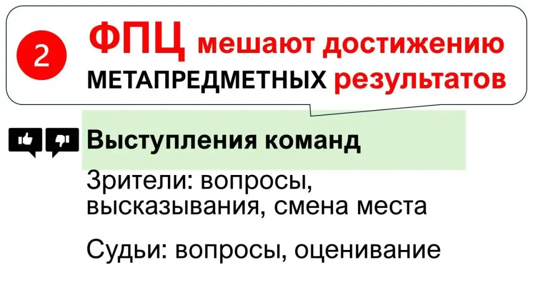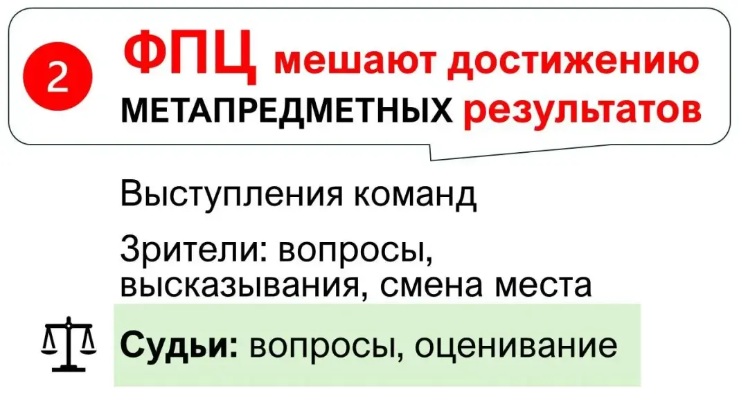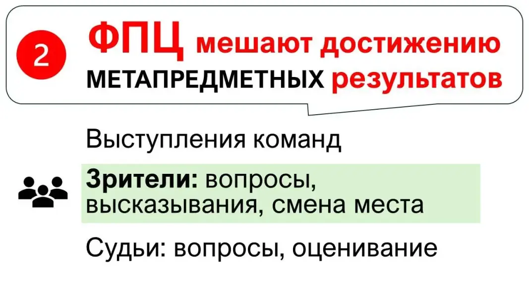 Ведущий объявляет второй раунд: «ФПЦ мешают достижению МЕТАПРЕДМЕТНЫХ результатов». |