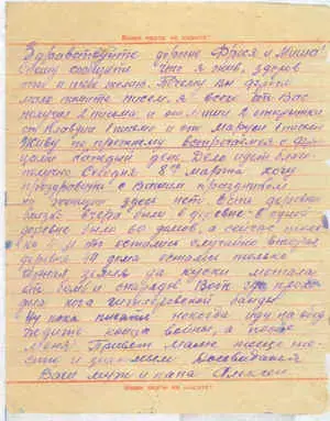 "Здравствуйте, милая жена Фрося и сыночек Миша. С 12 января участвую в самостоятельной молотьбе, намолотили очень много фрицев, буду молотить, пока работают наши большие молотилки и мы около них. Обо мне не беспокойся, жив буду, будем опять вместе, сына не обижайте. Сейчас пишу, а снаряды кругом рвутся, сейчас нахожусь от немцев метров 250. До свидания, целую вас, остаюсь невредим. Не забывайте. 16 января 43 год с фронта Волхов-Ленинград".