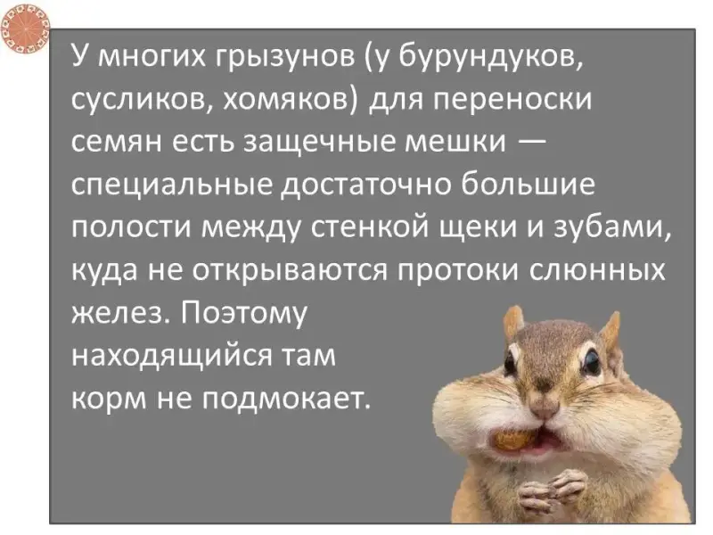 У многих грызунов (у бурундуков, сусликов, хомяков) для переноски семян есть защечные мешки - специальные достаточно большие полости между стенкой щеки и зубами, куда не открываются протоки слюнных желез. Поэтому находящийся там корм не подмокает. |