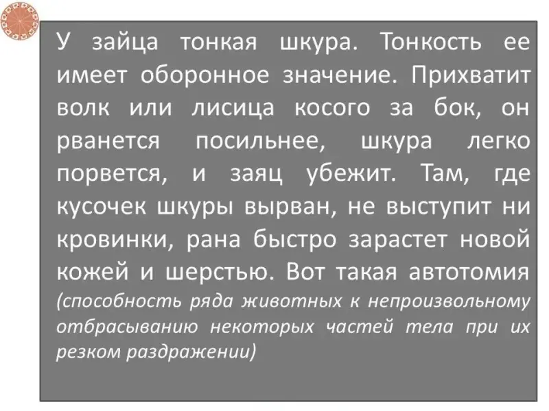 У зайца тонкая шкура. Тонкость ее имеет оборонное значение. Прихватит волк или лисица косого за бок, он рванется посильнее, шкура легко порвется, и заяц убежит. Там, где кусочек шкуры вырван, не выступит ни кровинки, рана быстро зарастет новой кожей и шерстью. Вот такая автотомия (способность ряда животных к непроизвольному отбрасыванию некоторых частей тела при их резком раздражении) |