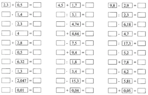 Так, например, при отработке навыков выполнения действий с десятичными дробями в 5 классе проводим математическую эстафету «Заполни клетку», каждая команда (ряд) получают листочки, текст которых приведён ниже. Учащиеся по очереди выполняют действия. Ответ предыдущего действия ставится в первую клетку следующего. Выигрывает та команда, которая первой скажет правильный ответ в последней клетке.