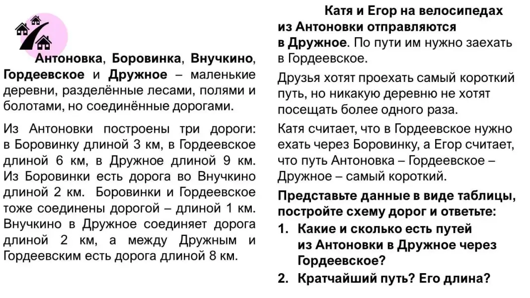 С другой стороны, хочется построить урок так, чтобы, получив задачи, сформулированные в виде примеров из жизни (дети, отправляясь на прогулку, выбирают путь), обучающиеся или вспомнили сами про информационную модель граф (тема курса «Вероятность и статистика», 7-8 класс), или с помощью учителя поняли, как использование графа помогает решать такие задачи.