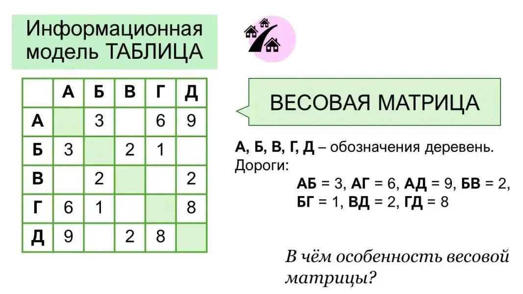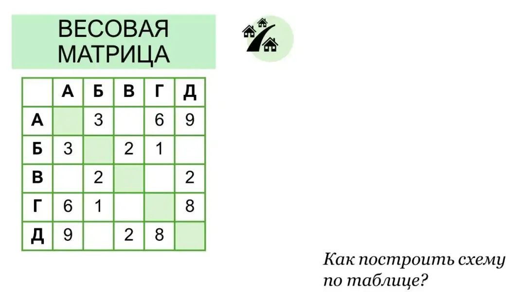 - Разбор решения задачи №1 с помощью представления информации в виде весовой матрицы, построения графа, актуализация знаний о графах (курс «Вероятность и статистика, 7-8 классы», основные понятия и применение графов). Слайды 7-22.
