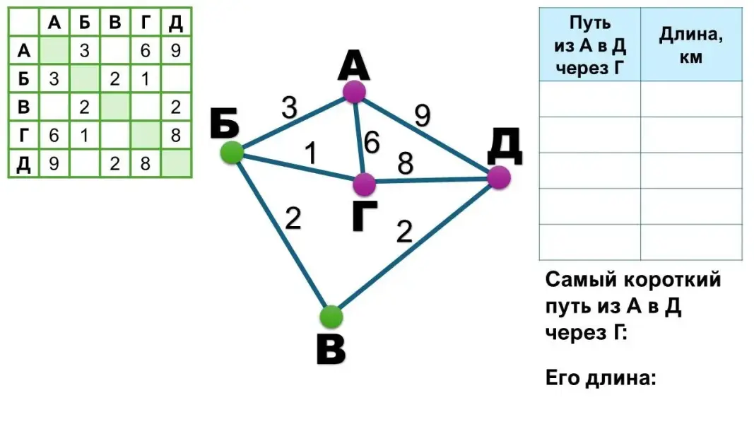 - Организация решения задачи на нахождение кратчайшего пути (вводная задача № 1). Слайды 3-6.