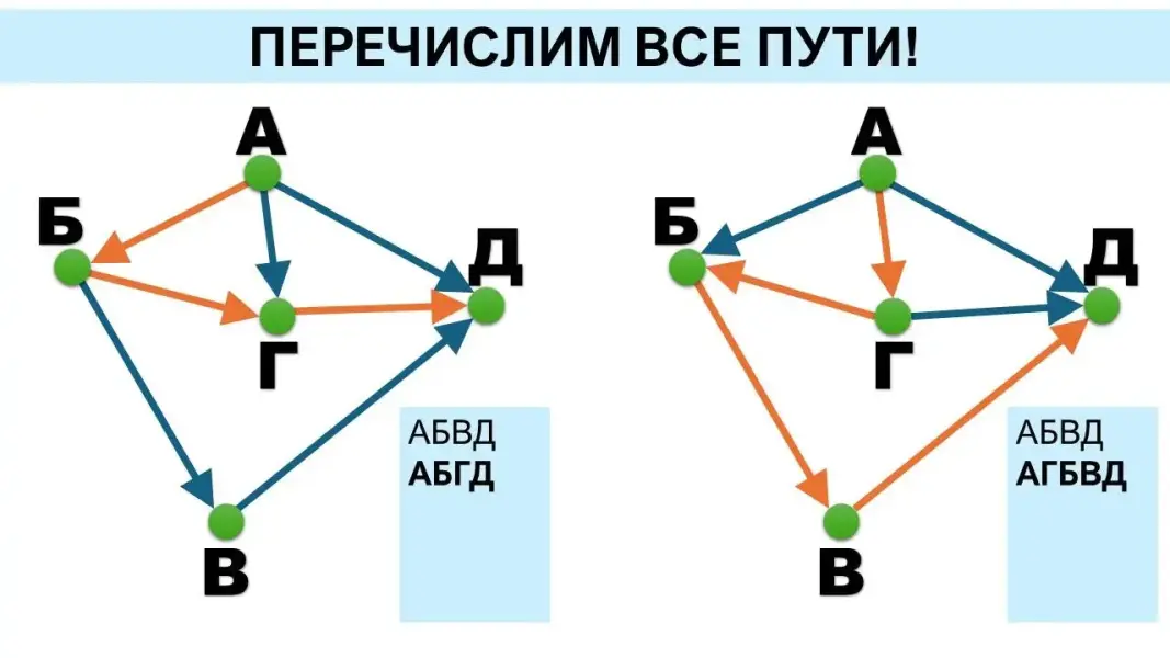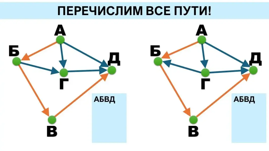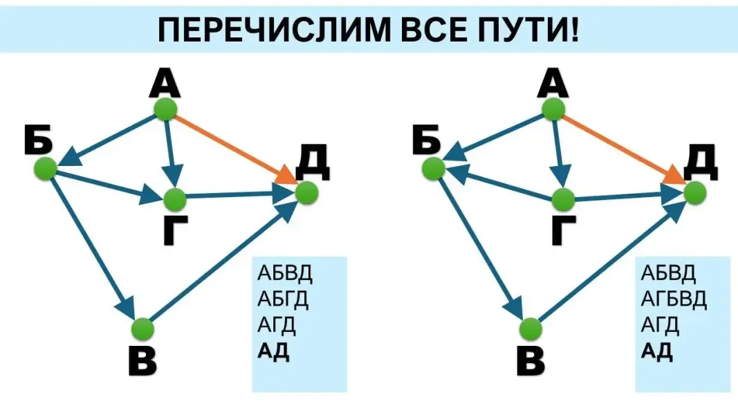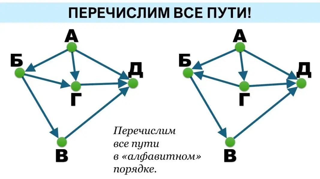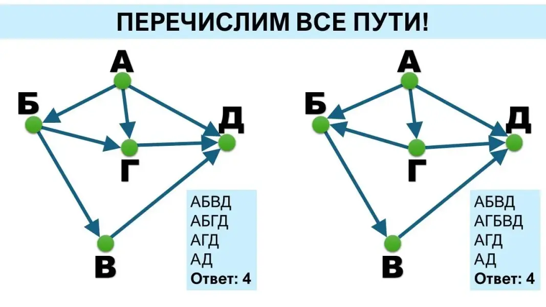 Представленного материала достаточно для двух уроков, с учётом того, что тема «Графы» изучена в курсе «Вероятность и статистика» в 7 классе и повторена в 8 классе. В углублённом курсе третий урок можно посвятить разбору эффективного способа решения задачи на количество путей в ациклическом орграфе.