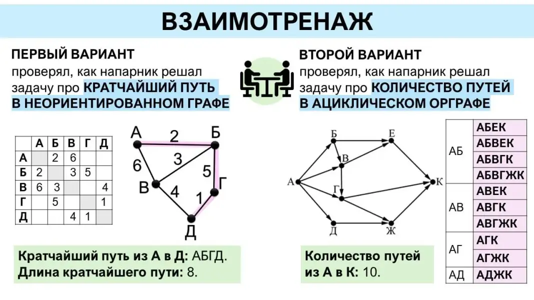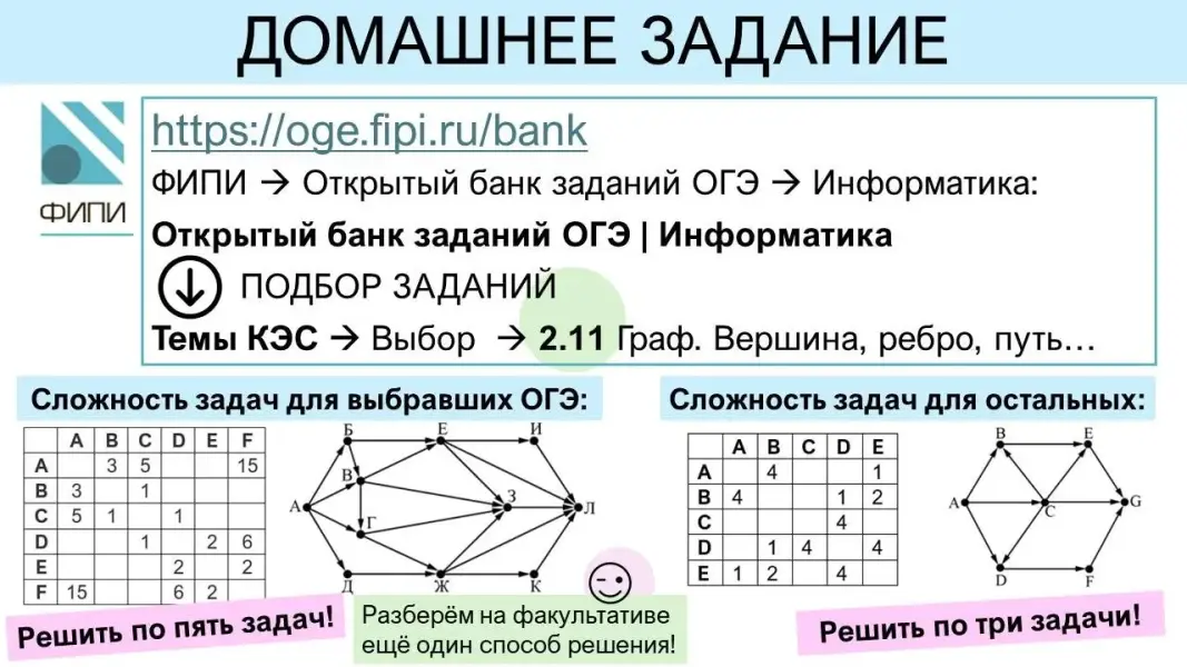 Хочу отметить, что одного урока в базовом курсе на изучение этой темы недостаточно. Особенно, если использовать системно-деятельностный подход, дать возможность обучающимся сначала самим решить задачи, самостоятельно выбирая способ решения, без подсказок вспомнить графы («Вероятность и статистика. 7-8 классы»), и только после этого разобрать решение, показать, до чего они «дошли сами», а каких знаний не хватило, и «встроить» недостающие знания. Так в углублённом курсе на эту тему выделено три урока (практически при тех же планируемых результатах). А в ОГЭ по информатике включены обе разбираемые задачи (№4 и №9). Причём для разбора второй нужно будет дополнительное время, например, на факультативе.