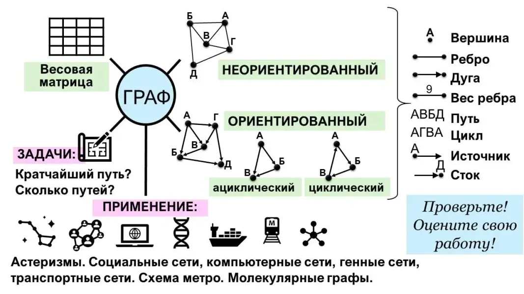 - Разбор решения задачи № 2 на ориентированном графе путём обхода графа, актуализация и новые знания: орграф (направленный граф), ациклический граф, дуга, источник, сток. Слайды 28-36.