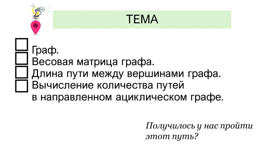 Уроки информатики в 9-м классе по теме «Граф. Весовая матрица графа. Длина пути между вершинами графа. Вычисление количества путей в направленном ациклическом графе»