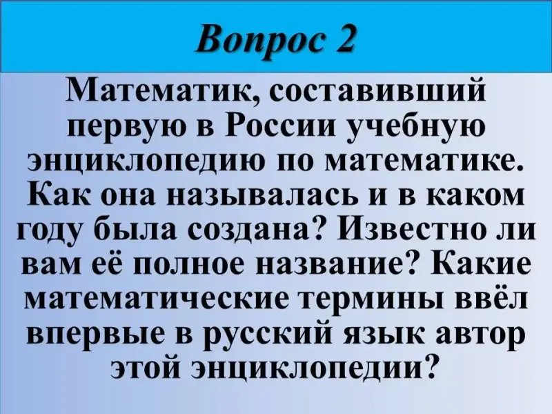 2) Математик, составивший первую в России учебную энциклопедию по математике. Как она называлась и в каком году была создана? Известно ли вам её полное название? Какие математические термины ввёл впервые в русский язык автор этой энциклопедии?