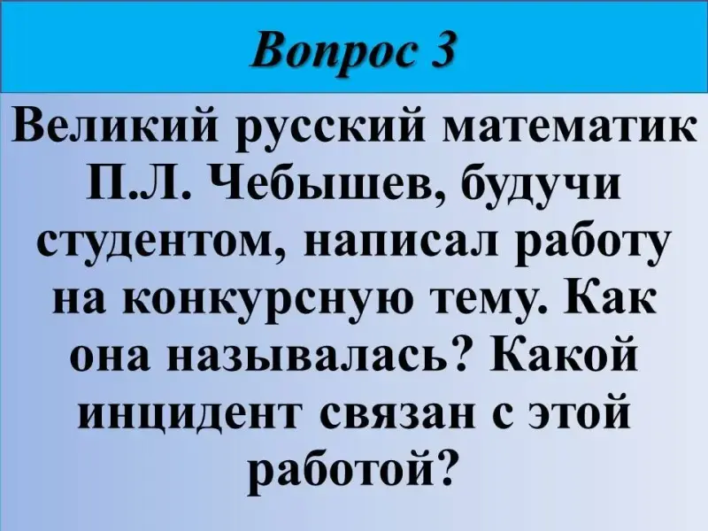 3) Великий русский математик П.Л. Чебышев, будучи студентом, написал работу на конкурсную тему. Как она называлась? Какой инцидент связан с этой работой?
