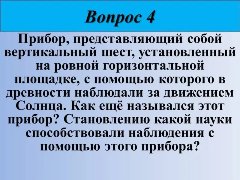4) Прибор, представляющий собой вертикальный шест, установленный на ровной горизонтальной площадке, с помощью которого в древности наблюдали за движением Солнца. Как ещё назывался этот прибор? Становлению какой науки способствовали наблюдения с помощью этого прибора?