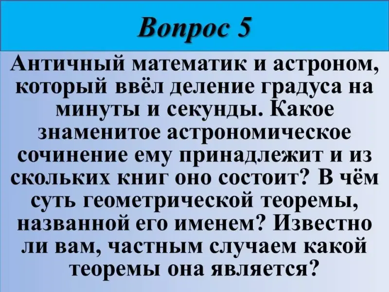 5) Античный математик и астроном, который ввёл деление градуса на минуты и секунды. Какое знаменитое астрономическое сочинение ему принадлежит и из скольких книг оно состоит? В чём суть геометрической теоремы, названной его именем? Известно ли вам, частным случаем какой теоремы она является?