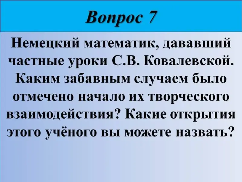 7) Немецкий математик, дававший частные уроки С.В. Ковалевской. Каким забавным случаем было отмечено начало их творческого взаимодействия? Какие открытия этого учёного вы можете назвать?