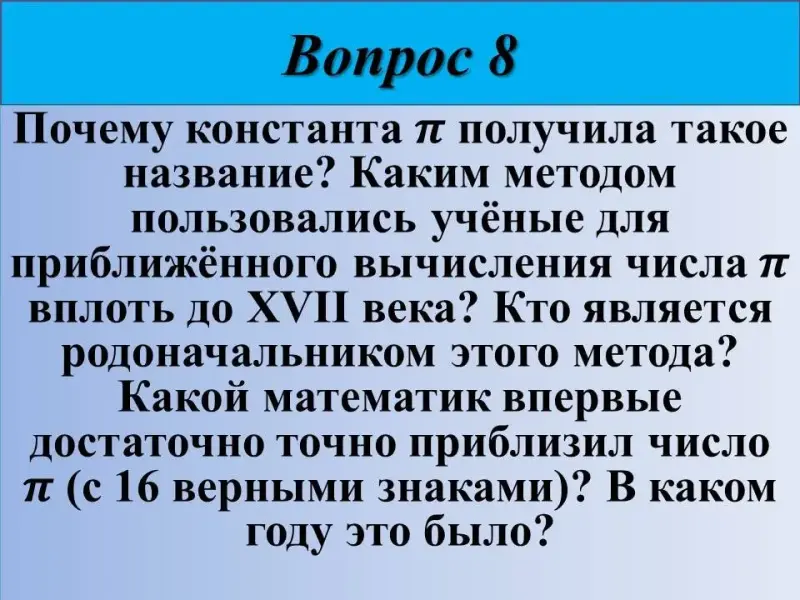 8) Почему константа π получила такое название? Каким методом пользовались учёные для приближённого вычисления числа вплоть до XVII века? Кто является родоначальником этого метода? Какой математик впервые достаточно точно приблизил число π (с 16 верными знаками)? В каком году это было?
