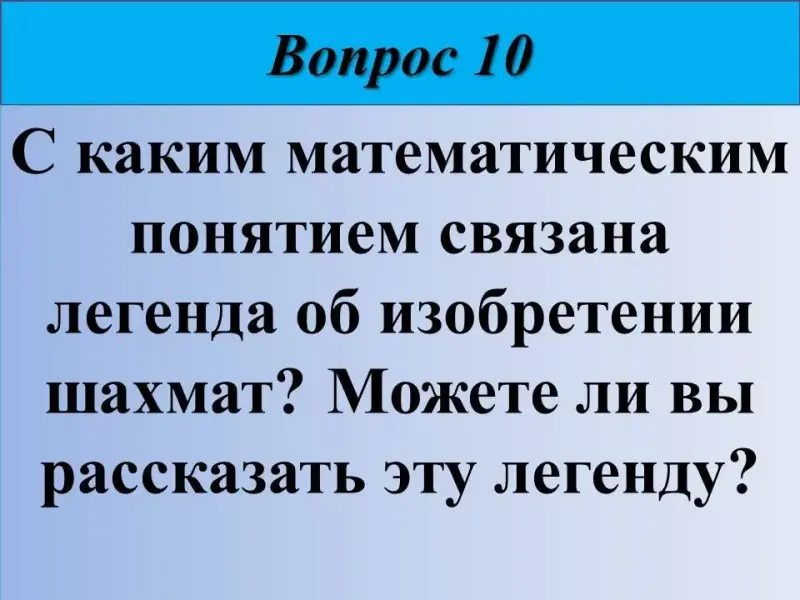 10) С каким математическим понятием связана легенда об изобретении шахмат? Можете ли вы рассказать эту легенду?