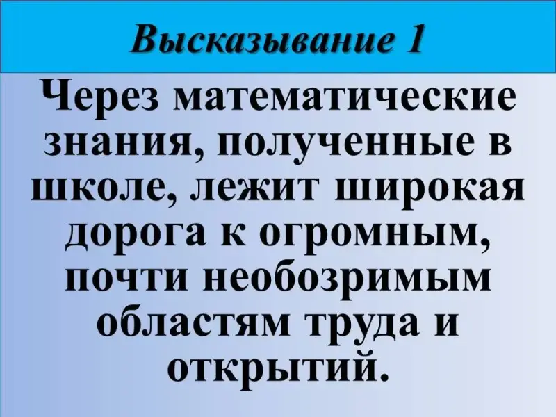 1) Через математические знания, полученные в школе, лежит широкая дорога к огромным, почти необозримым областям труда и открытий. Русский математик Алексей Иванович Маркушевич (1908-1979).