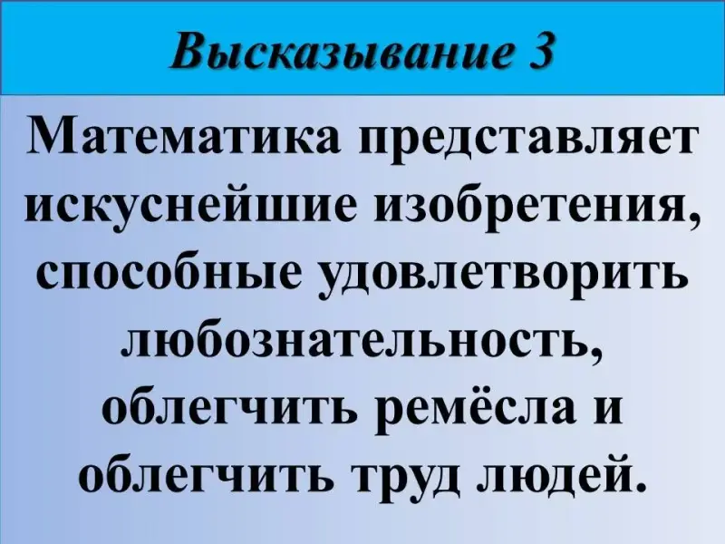 3) Математика представляет искуснейшие изобретения, способные удовлетворить любознательность, облегчить ремёсла и облегчить труд людей. Французский математик Рене Декарт (1596-1650).
