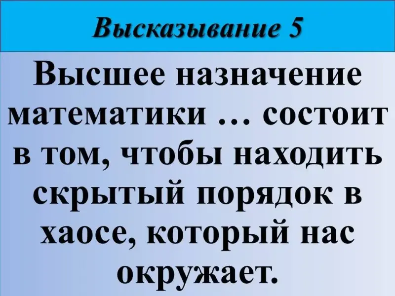 5) Высшее назначение математики … состоит в том, чтобы находить скрытый порядок в хаосе, который нас окружает. Американский математик Норберт Винер (1894-1964).