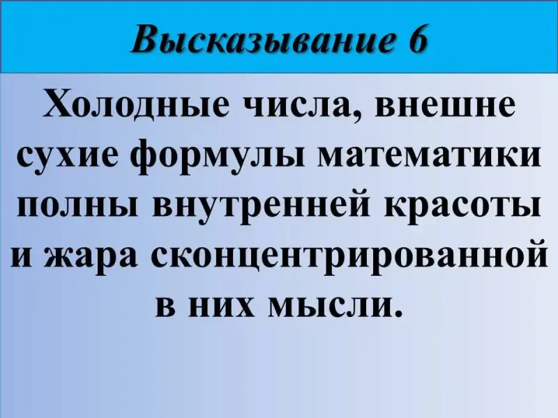 6) Холодные числа, внешне сухие формулы математики полны внутренней красоты и жара сконцентрированной в них мысли. Русский математик Александр Данилович Александров (1912-1999).