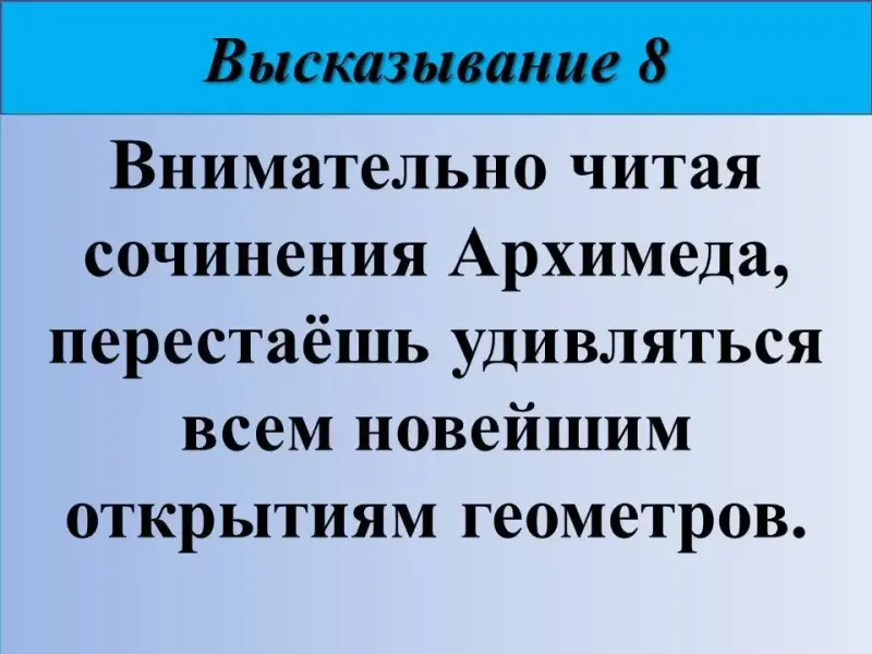8) Внимательно читая сочинения Архимеда, перестаёшь удивляться всем новейшим открытиям геометров. Немецкий математик Готфрид Вильгельм Лейбниц (1646-1716).