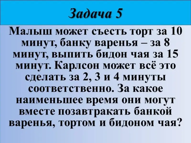 6) Малыш может съесть торт за 10 минут, банку варенья - за 8 минут, выпить бидон чая за 15 минут. Карлсон может всё это сделать за 2, 3 и 4 минуты соответственно. За какое наименьшее время они могут вместе позавтракать банкой варенья, тортом и бидоном чая?