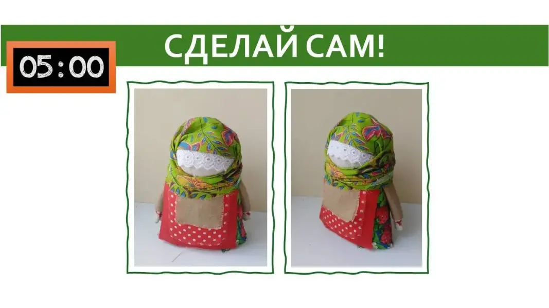 Слайд 5. Таймер на 5 минут. Участники мастер-класса собирают (пробуют собрать) из материалов оберег по фотографии на слайде.