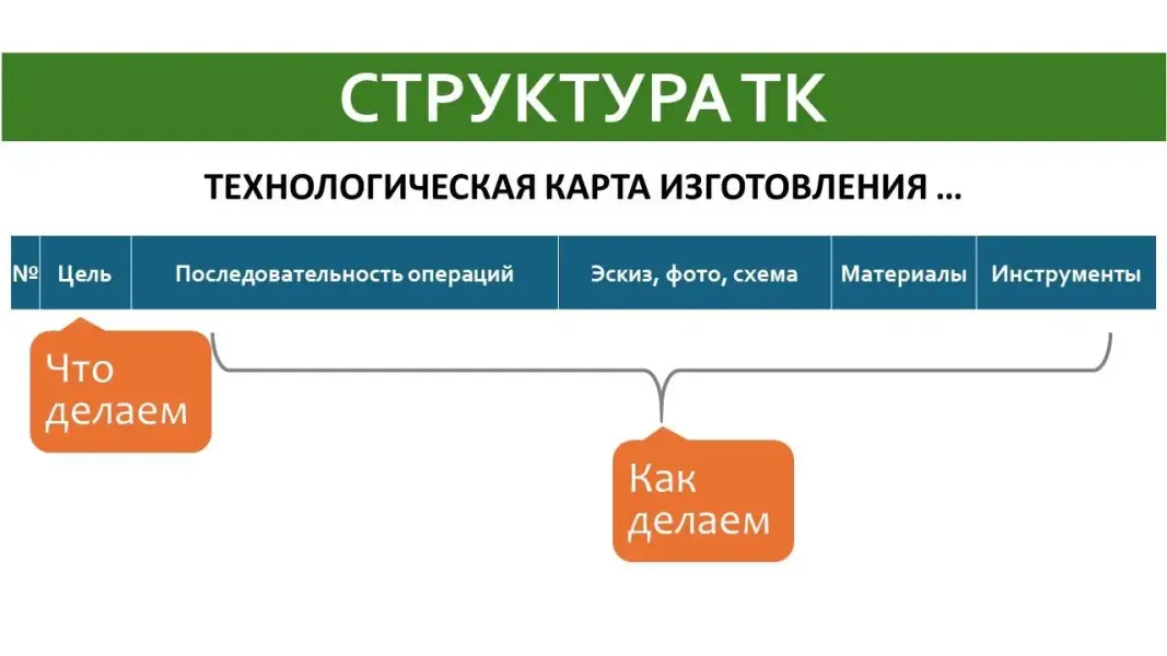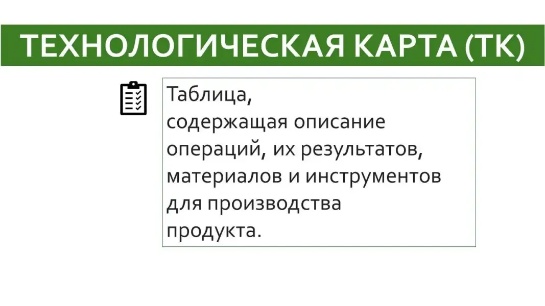 Слайд 11. Технологическая карта представляет из себя таблицу, содержащую описание операций, их результатов, материалов и инструментов для производства продукта.