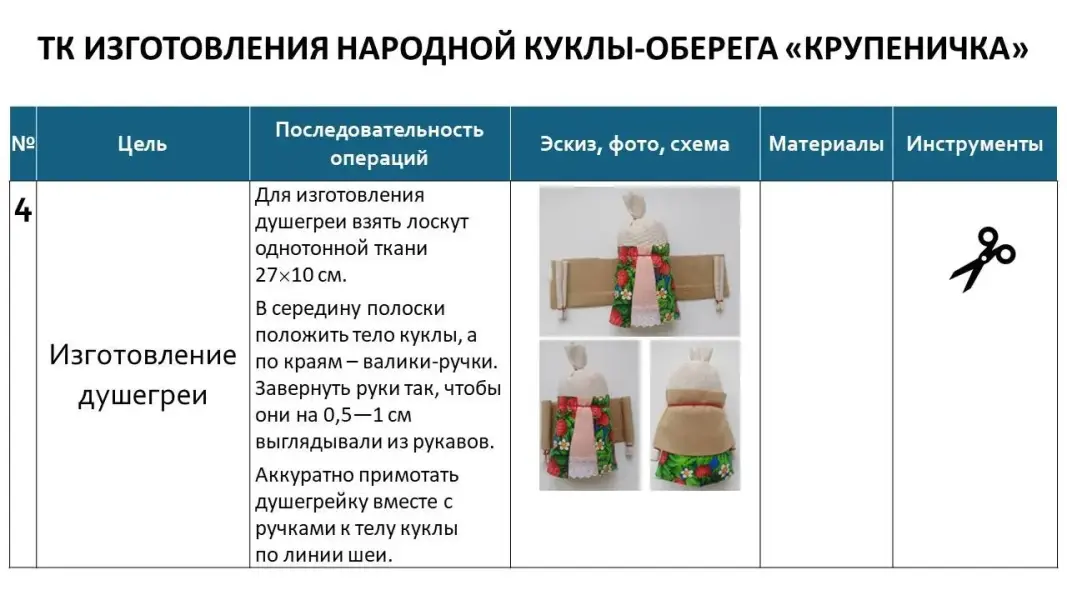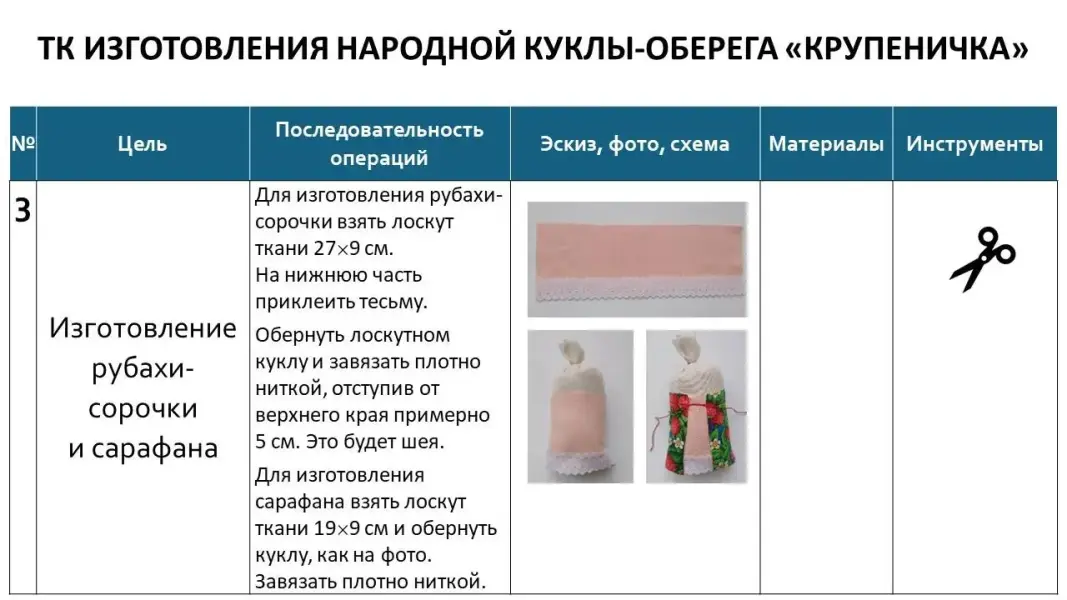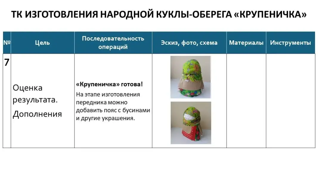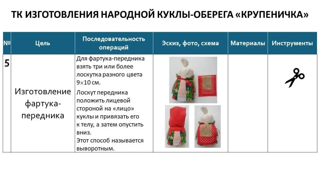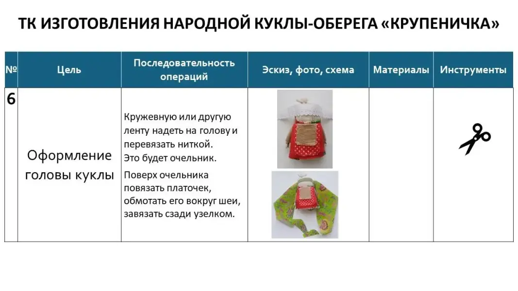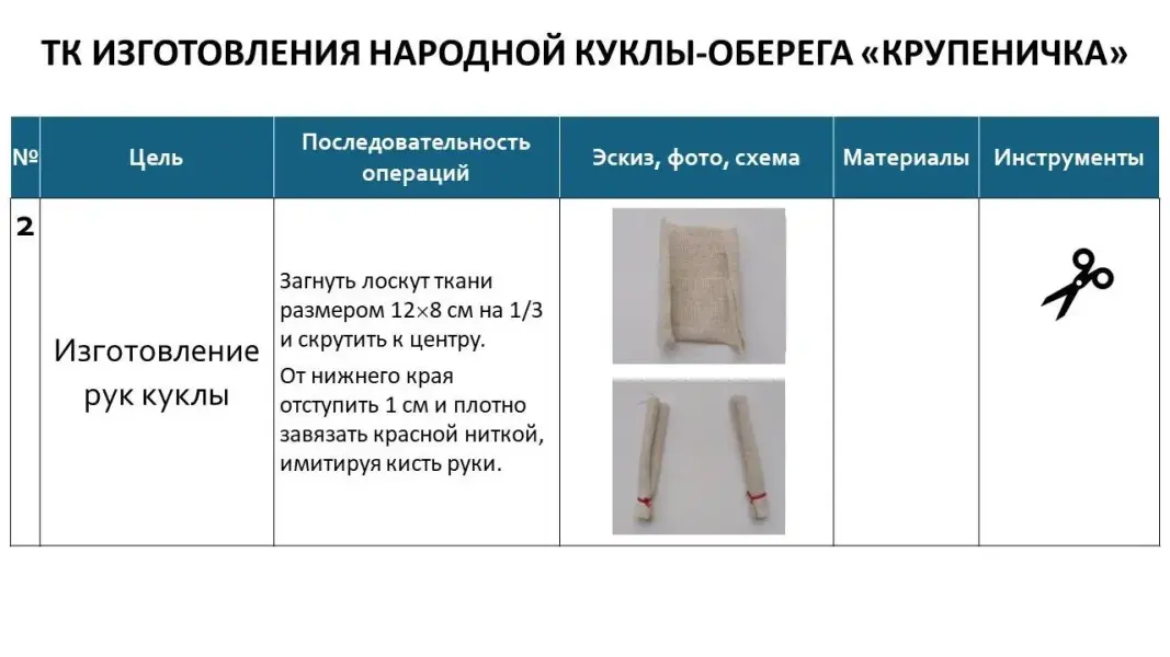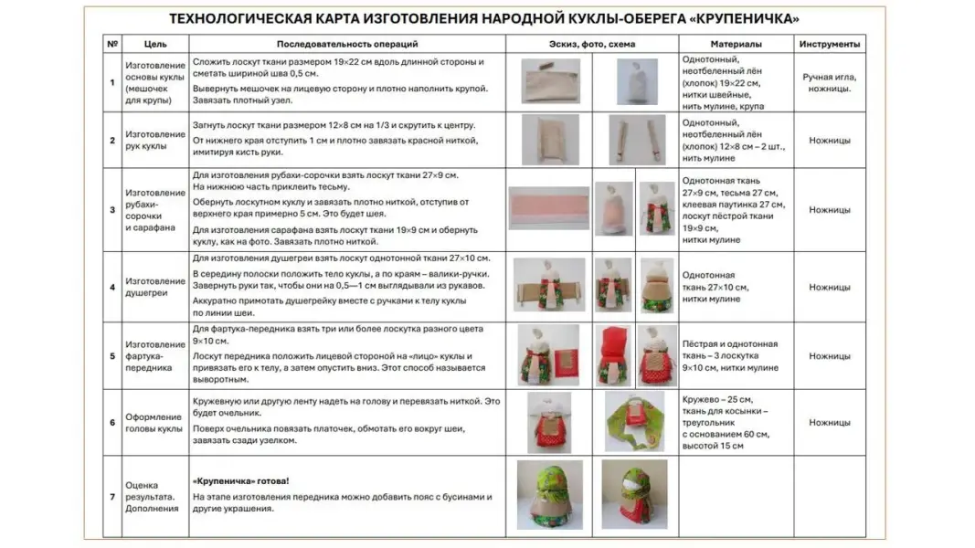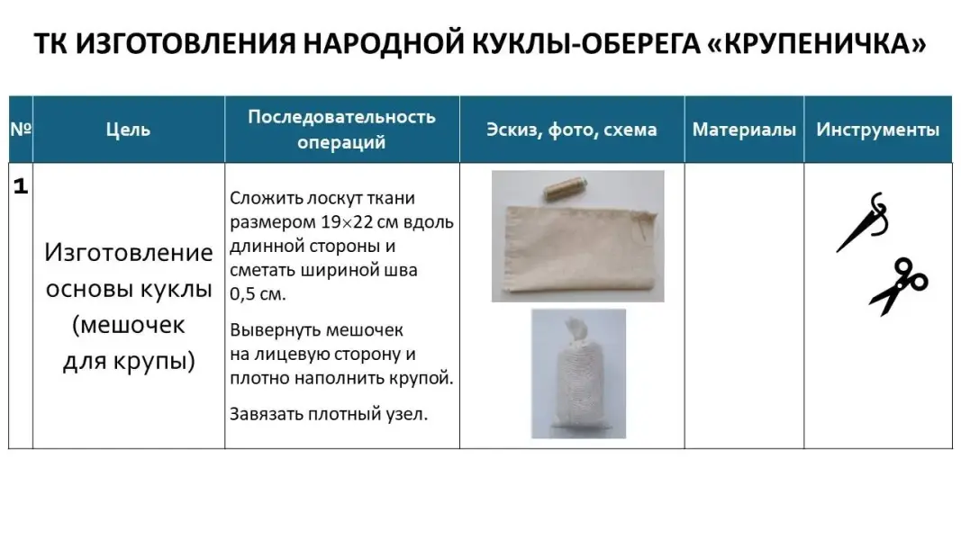 Слайд 13. Давайте посмотрим, как выглядит технологическая карта изготовления куклы-оберега «Крупеничка».