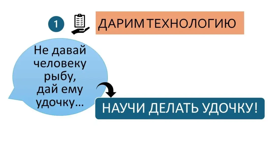 Слайд 23. Первый эффект - через технологическую карту мы дарим технологию. Часто говорят: «Не давай человеку рыбу, дай ему удочку!» Я бы дополнила «Научи делать удочку!» Передавая технолгию через технологическую карту, мы запускаем кругооборот, обмен мастерством. Вот как я это вижу.