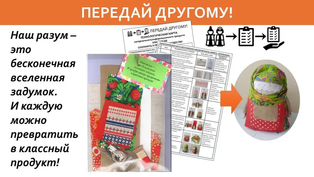 Слайд 41. Сегодня я перадаю вам мастерство создания куклы-оберега Крупеничка через технологическую карту её изготовления. Давайте помнить, что «Наш разум - это бесконечная вселенная задумок. И каждую можно превратить в классный продукт!»