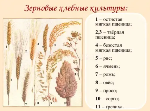 Хлебных зерновых культур в природе встречается довольно много, но самые питательные для человека является рожь и пшеница. Из пшеничного зерна получается пшеничная мука, из которой делают белый хлеб, булки, пирожки, баранки, различное печенье, сушки и другие мучные изделия. Из ржаных зерен получают ржаную муку, и пекари выпекают ржаной хлеб. В ржаном хлебе на 30% больше калия и на 50% - магния, чем в белом хлебе.