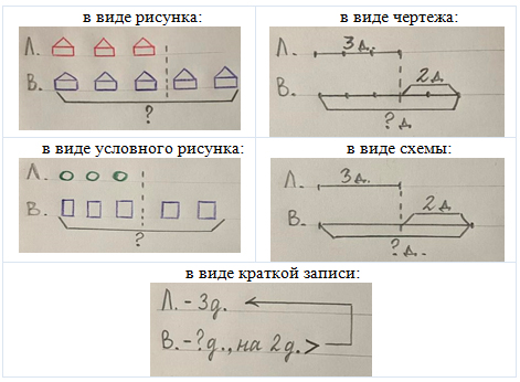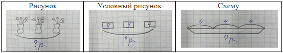 Поэтому, чтобы структура задачи стала предметом анализа и изучения, необходимо отделить ее от всего несущественного и представить в таком виде, который обеспечивал бы необходимые действия. Сделать это можно путем особых знаково-символических средств – моделей, однозначно отображающих структуру задачи и достаточно простых для восприятия младшим школьником.