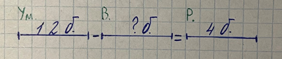 - выполняется решение: в начале 2-го класса – выражением 12 – 4=8(б.), а по мере изучения темы «Уравнение» – запись решения задачи в виде уравнения: 12 – х = 4.
