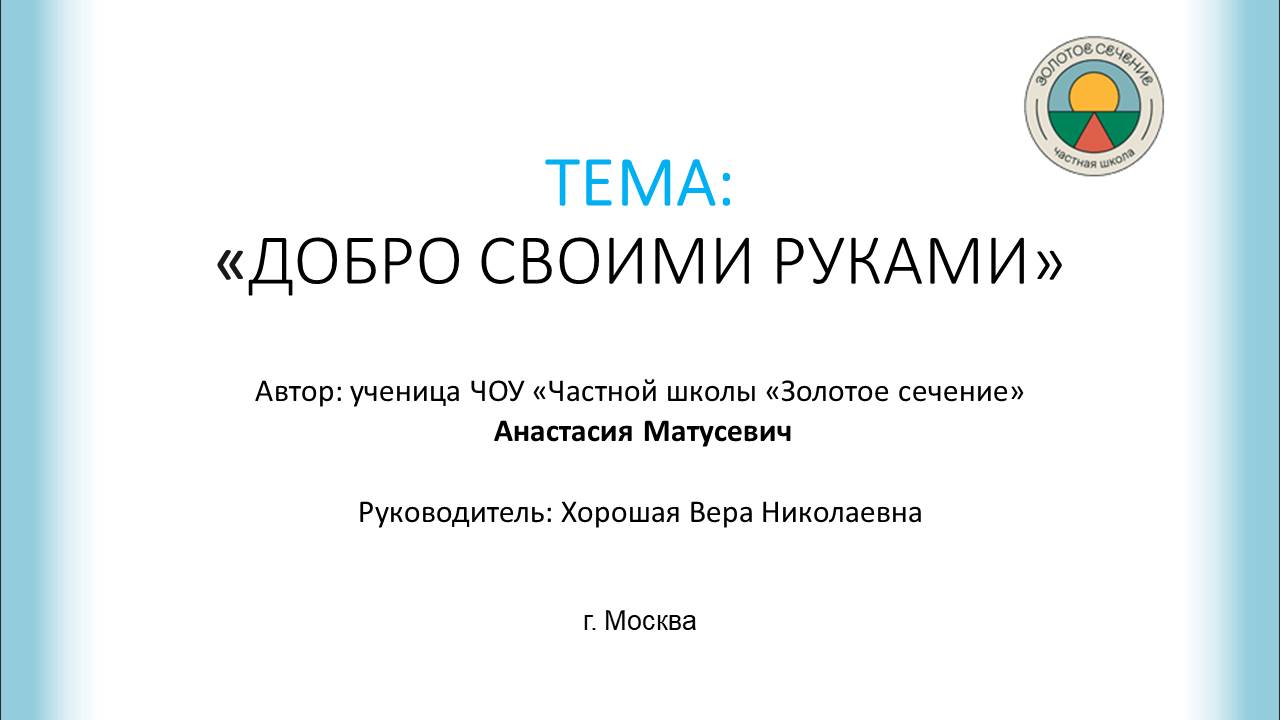 «Твори добро на всей земле, твори добро другим во благо...». Слова этой песни известны многим. Человек должен жить в атмосфере добра. Эта атмосфера добра в большей степени создается им самим: из его добрых дел и добрых чувств.