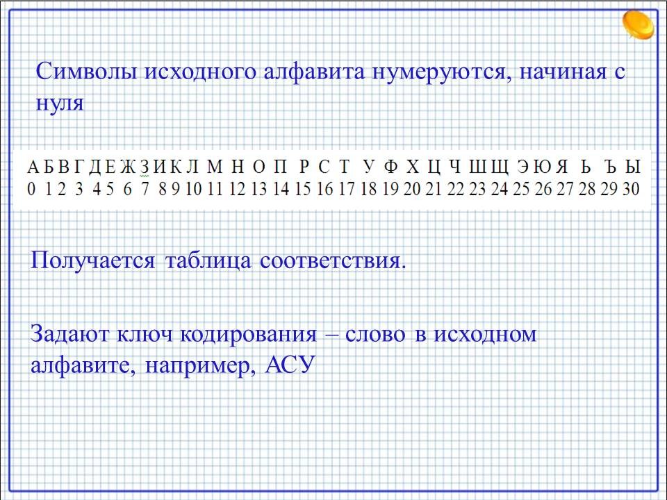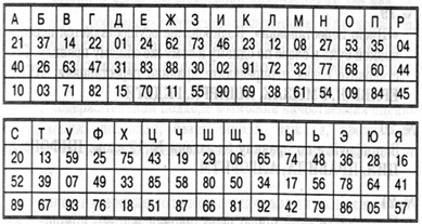 Каждая буква алфавита может быть заменена любым числом соответствующего столбика таблицы.