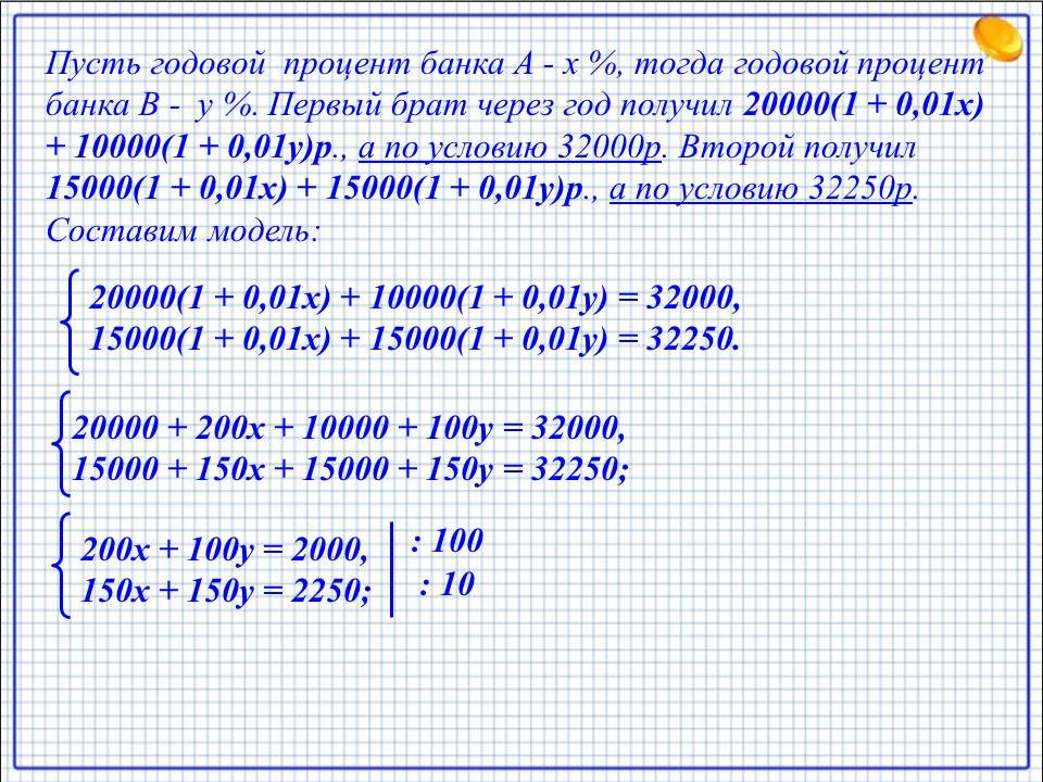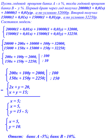 У двух братьев было по 30000р. Они положили свои деньги в бани А и В, первый соответственно, 20000р. и 10000р., а второй – по 15000р. Через год, закрыв счета, первый брат получил на руки 32000р., а второй – 32250р. Каков годовой процент в банке А и каков - в банке В?
