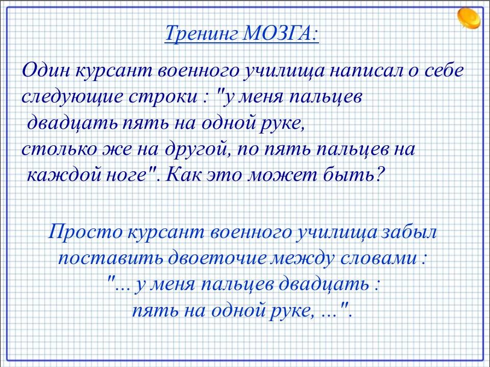 - Один курсант военного училища написал о себе следующие строки: "у меня пальцев двадцать пять на одной руке, столько же на другой, по пять пальцев на каждой ноге". Как это может быть? (Просто курсант военного училища забыл поставить двоеточие между словами: "... у меня пальцев двадцать: пять на одной руке, ...".)