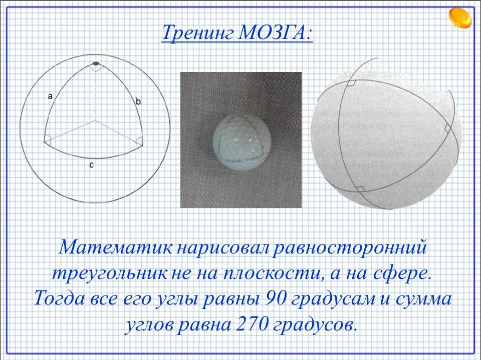- Известно, что сумма углов любого треугольника равна 180 градусам. Но один математик все-таки нашел способ начертить треугольник такой, что каждый его угол равен 90 градусам и сумма его углов равна 270 градусов. (Математик нарисовал равносторонний треугольник не на плоскости, а на сфере. Тогда все его углы равны 90 градусам и сумма углов равна 270 градусов.)