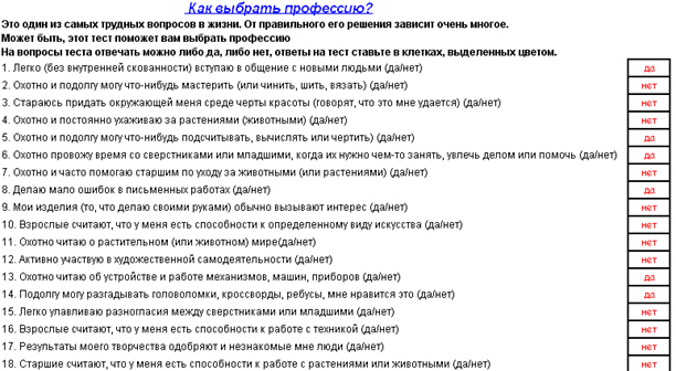 Условие выполнения первых четырех проектов: проекты выполняются с помощью электронных таблиц Microsoft Excel, с использованием логической функции ЕСЛИ(). Создание тестов с помощью логической функции ЕСЛИ(), защита тестов, очистка ячеек ответов с помощью макросов достаточно подробно описана в литературе. Тематика тестов может быть выбрана самими учащимися, возможно, предложена учителем. Приведем пример теста «Как выбрать профессию?» (рис. 1).