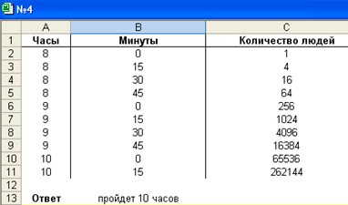 Задача. "Модель распространения слухов". Один человек в 8 часов утра увидел НЛО. В течение 15 минут он встретил трех своих знакомых и рассказал им об этом. В течении следующих 15 минут каждый из этих троих знакомых тоже встретил трех своих знакомых и т.д. Продемонстрируйте процесс, пока количество людей не станет больше 100 000. Сколько пройдет часов?