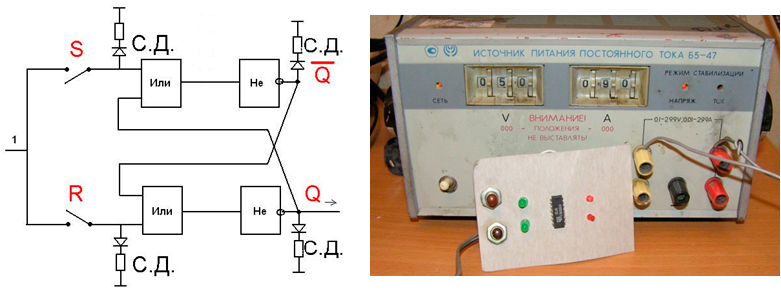 В качестве проекта - наглядного пособия «Логические основы работы компьютера» предлагается схема, выполненная учеником и реализующая три основные логические операции: логических элементов «ИЛИ», «НЕ» – «Триггер – элементарная единица памяти».