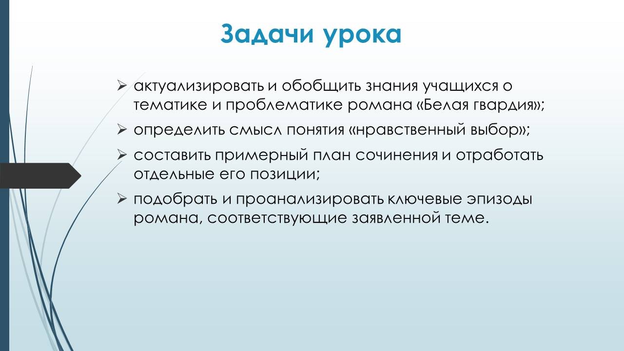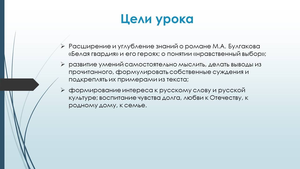 - расширение и углубление знаний о романе М.А.Булгакова «Белая гвардия» и его героях; о понятии «нравственный выбор»;