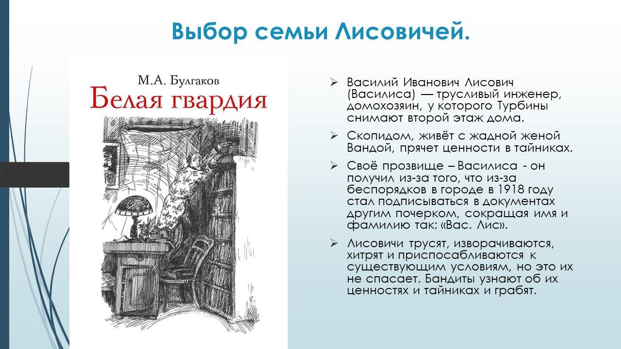 Василий Иванович Лисович (Василиса) — трусливый инженер, домохозяин, у которого Турбины снимают второй этаж дома. Скопидом, живёт с жадной женой Вандой, прячет ценности в тайниках. Своё прозвище – Василиса - он получил из-за того, что из-за беспорядков в городе в 1918 году стал подписываться в документах другим почерком, сокращая имя и фамилию так: «Вас. Лис». Лисовичи трусят, изворачиваются, хитрят и приспосабливаются к существующим условиям, но это их не спасает. Бандиты узнают об их ценностях и тайниках и грабят.
