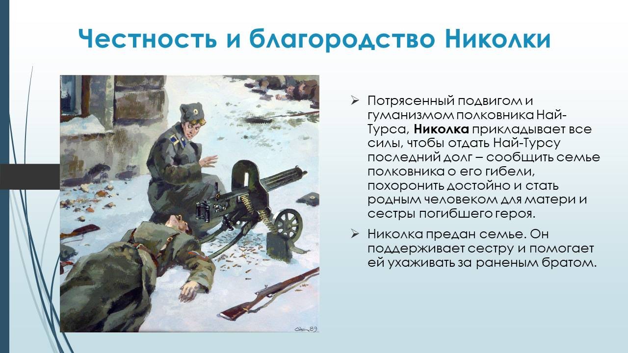 Потрясенный подвигом и гуманизмом полковника, Николка прикладывает все силы, чтобы отдать Най-Турсу последний долг – сообщить семье полковника о его гибели, похоронить достойно и стать родным человеком для матери и сестры погибшего героя.